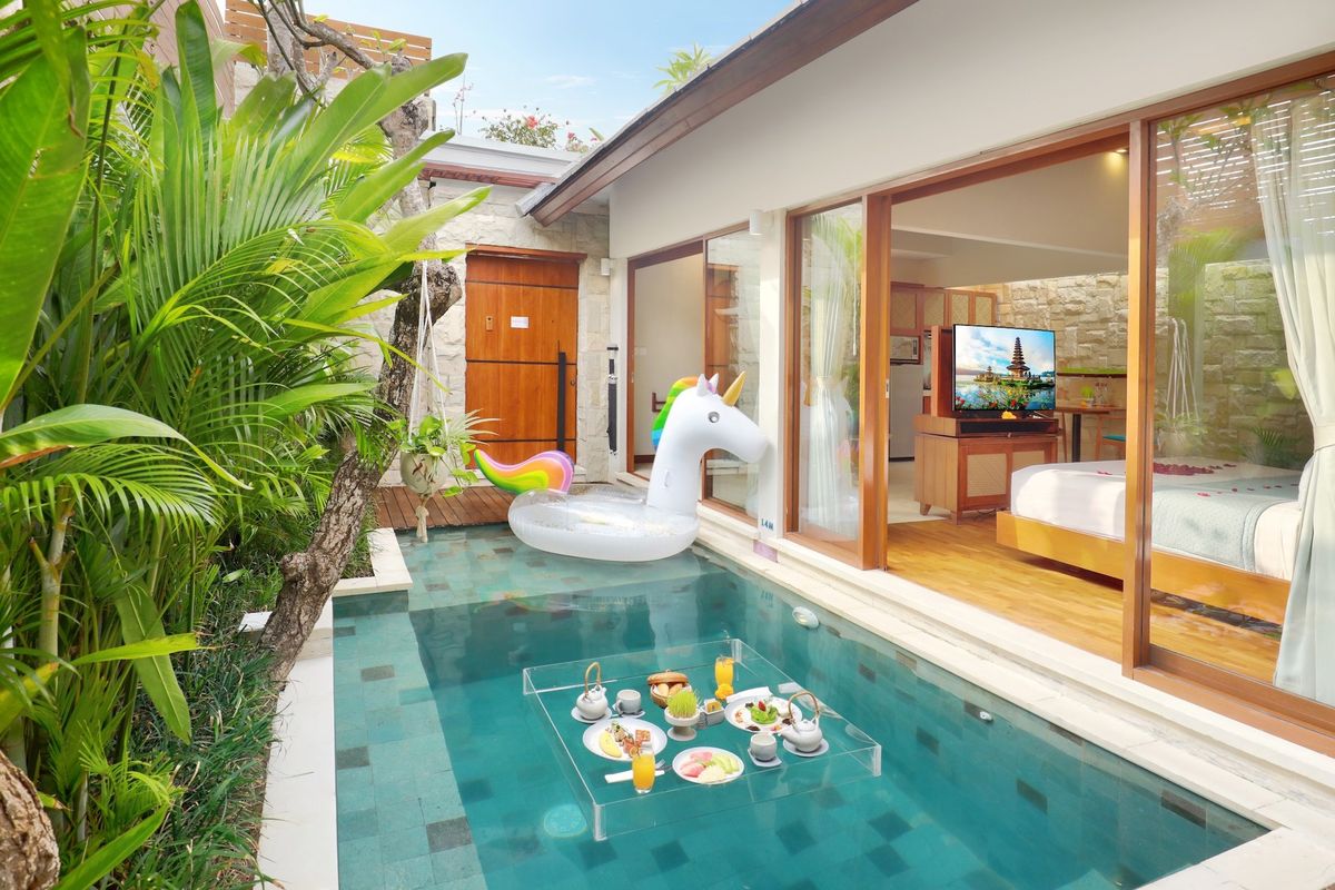 - Kolam renang besar, terkadang infinity pool dengan view laut atau sawah